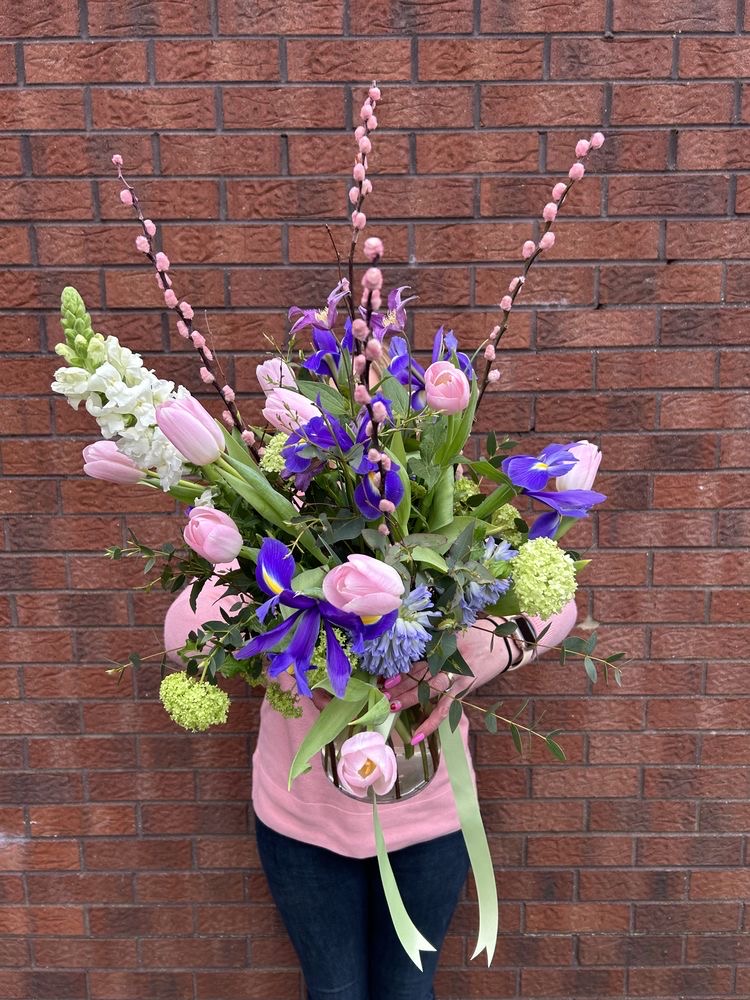 A Mother’s Day Special our Spring Vase is the freshest Spring Flowers in a keepsake glass vase. A mix of Iris, Tulips, Stocks, Snapdragons, Pussy Willow, Alstroemeria and Irish grown eucalytptus.
