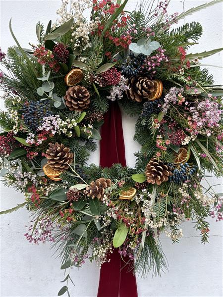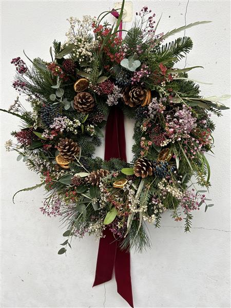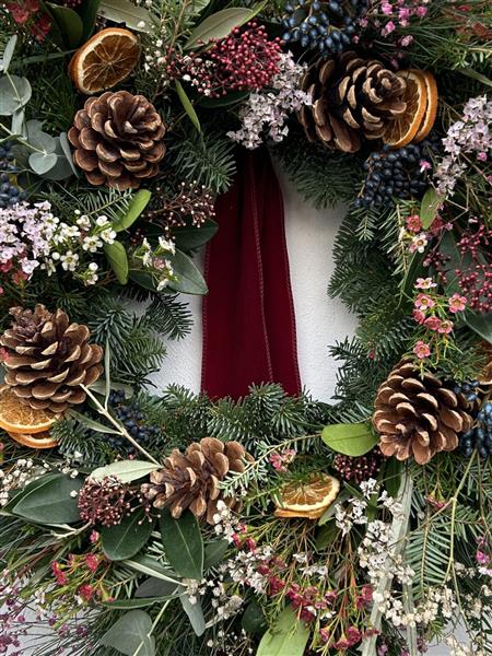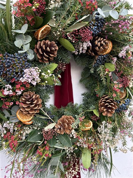 Hand made with love by Ditsy Floral Design and designed to last 6-8 weeks. We make our door wreaths on a wire frame and don’t use foam rings which aren’t very eco-friendly.
