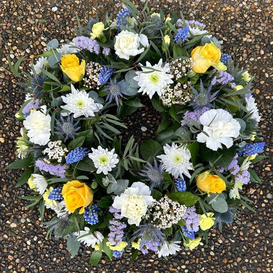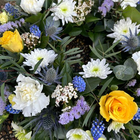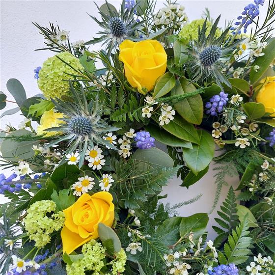 A bespoke grave wreath in special memory with seasonal long lasting fresh flowers and whimsical garden foliages. Our grave wreaths are very natural in style.