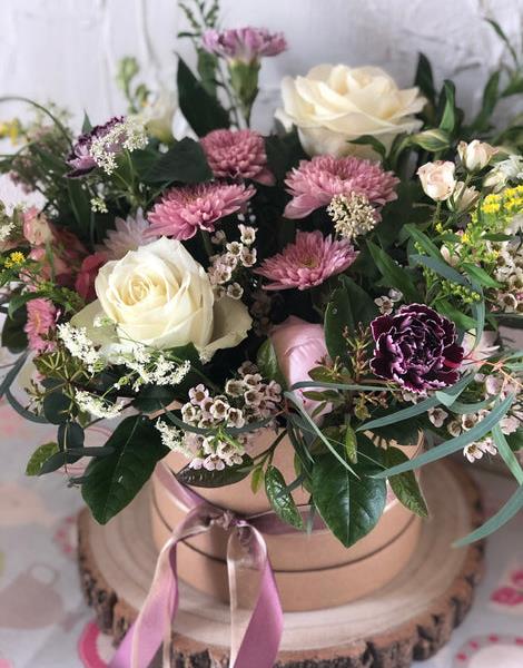 A Special Mother’s Day Hat Box floral arrangement in my signature Ditsy Style a very popular option available in either standard or large size.
