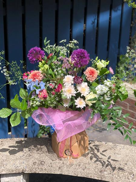 A deluxe version of our favourite Seasonal Hand Tied Gift Bouquet in our Signature Ditsy Style presented in a water filled presentation vase.