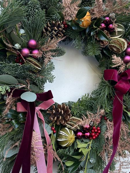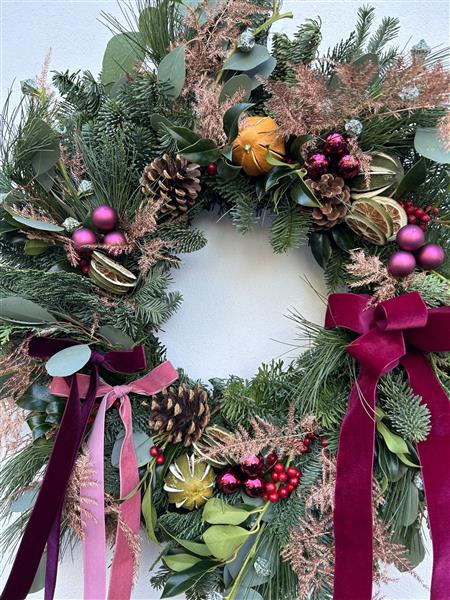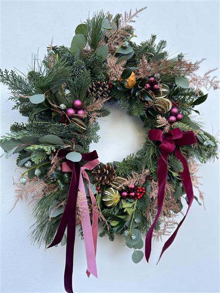 Whimsy Velvet Bow Wreath is a romantic take on traditional festive styling created with mixed fresh foliages – spruce, conifer, eucalyptus, coloured fern and all natural decorations such as pine cones, dried limes and deep pink & burgundy baubles. Finished with trailing velvet ribbons. It’s just so pretty!