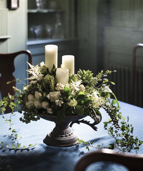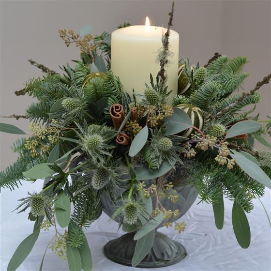 We will be creating an urn design with candles in an urn shaped container with seasonal foliages and seasonal decorations such as pine cones, lotus seed heads, cinnamon stick etc.