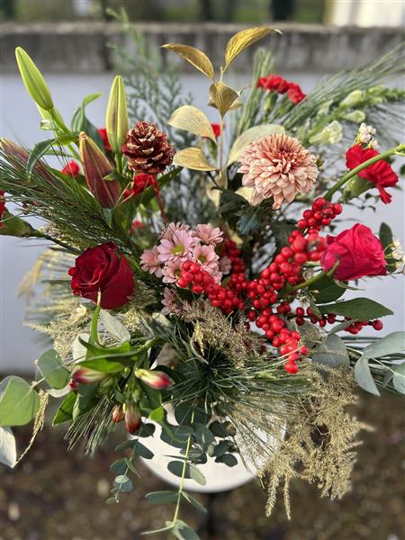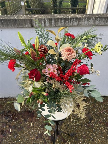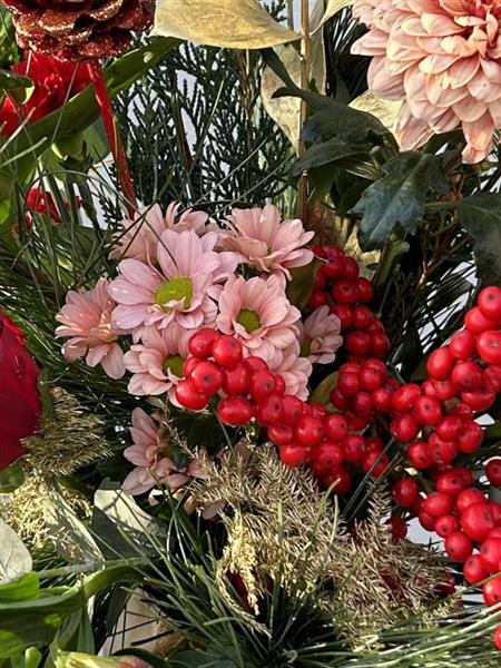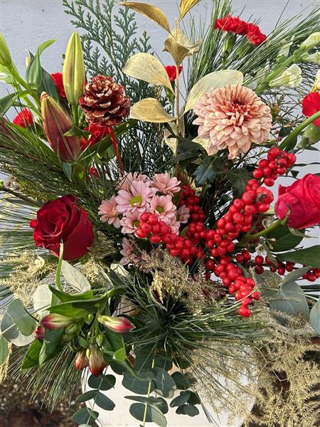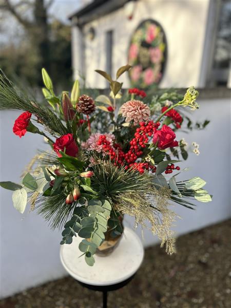 A Seasonal Special our Winter Vase is a gorgeous festive arrangement in a keepsake glass vase. Berries and blooms with Christmas foliages in decadent red, blush and gold tones, it’s a very special present.